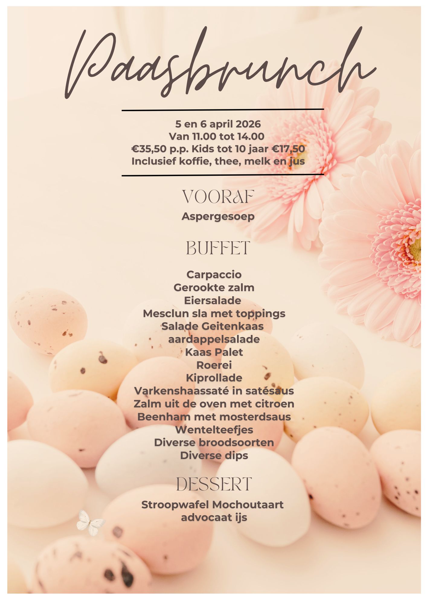 Wij zijn op beide paasdagen geopend. De brunch wordt geserveerd van 11.00u-14.00u.